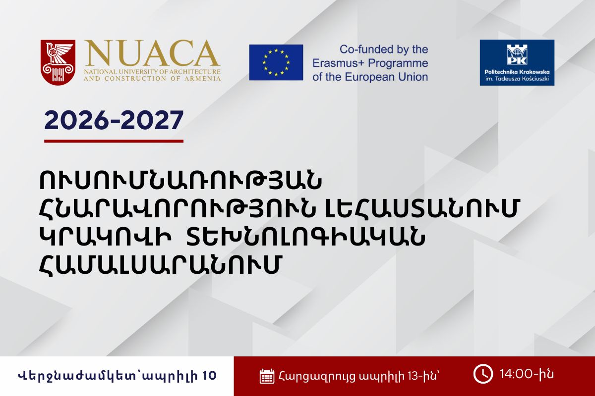 Էրազմուս+ KA107 դրամաշնորհային ծրագրի շրջանակում ՃՇՀԱՀ-ը հայտարարում է մրցույթ՝ 2026-2027 ուստարվա առաջին կիսամյակում