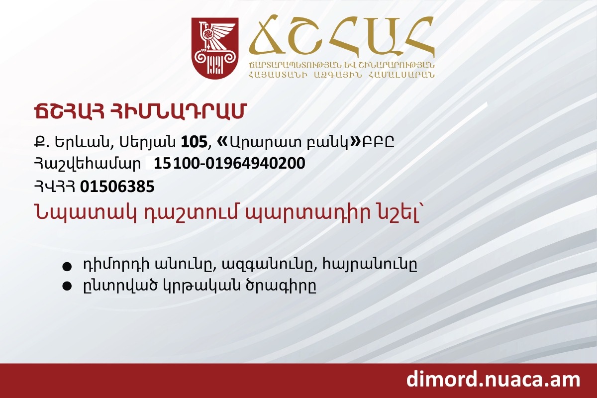 Հարգելի՛ դիմորդներ, եթե պատրաստվում եք դիմել Ճարտարապետության և շինարարության Հայաստանի ազգային համալսարան, տեղեկացնում ենք, որ dimord.am կայքում ընդունելության դիմում֊հայտ ներկայացնելիս անհրաժեշտ է կցել`