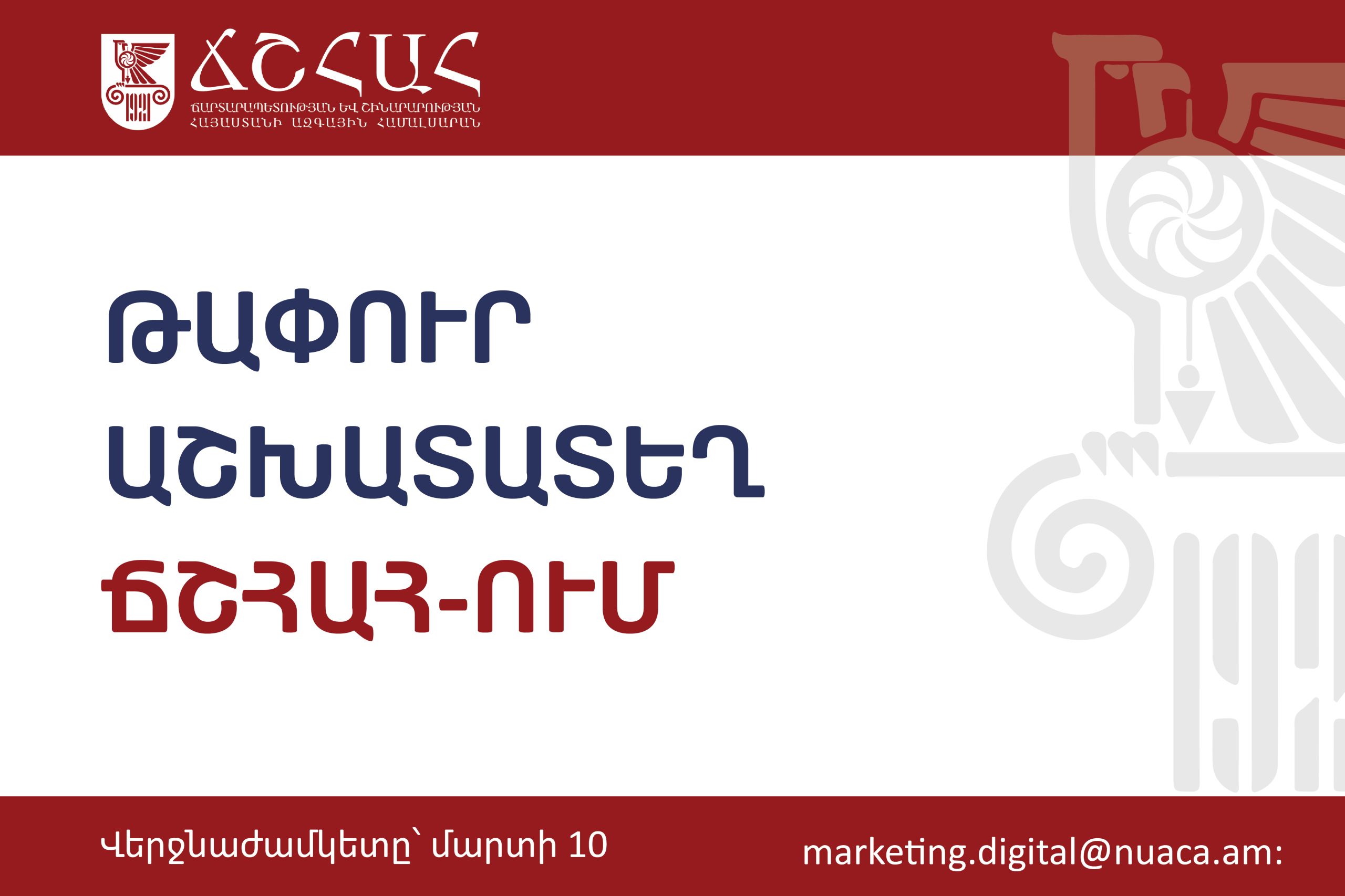 Սիրելի՛ համալսարանականներ, սիրով տեղեկացնում ենք, որ Ճարտարապետության և շինարարության Հայաստանի ազգային համալսարանում մեկնարկել է ամբիոնների կողմից կազմակերպվող համալսարանական սեմինարների  գարնանային շրջափուլը: