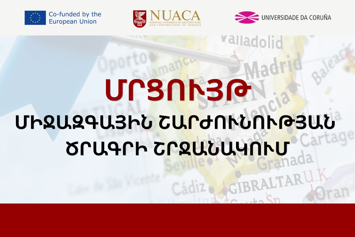 Ճարտարապետության և շինարարության Հայաստանի ազգային համալսարանը Էրազմուս+ KA-171 միջազգային շարժունության ծրագրի շրջանակում հայտարարում է մրցույթ՝ Իսպանիայի Կորունյայի համալսարանում (Universidade da Coruña) 2025-2026 ուստարվա մայիսի 18-22-ը դասախոսություններ կարդալու, փորձի փոխանակում իրականացնելու մեկ տեղի համար: