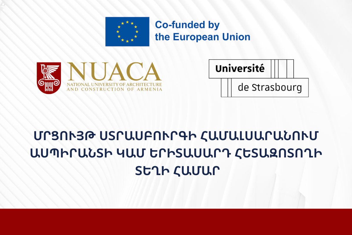 Էրազմուս+ KA171 դրամաշնորհային ծրագրի շրջանակում ՃՇՀԱՀ-ը հայտարարում է մրցույթ՝ 2026-2027 ուստարվա ընթացքում Ստրասբուրգի համալսարանում (Strasbourg University) ասպիրանտի կամ երիտասարդ հետազոտողի 1 տեղի համար: Աշխատանքային լեզուն` անգլերենն է, ֆրանսերենի իմացությունը ողջունելի է: Մասնակցի նախնական ընտրությունը կկատարվի ՃՇՀԱՀ-ում մրցութային կարգով` հարցազրույցի ձևաչափով: Վերջնական ընտրությունը կկայացնի Ընդունող բուհը` Ստրասբուրգի համալսարանը՝ համապատասխան հետազոտական աշխատանքի ղեկավարի հաստատման դեպքում: