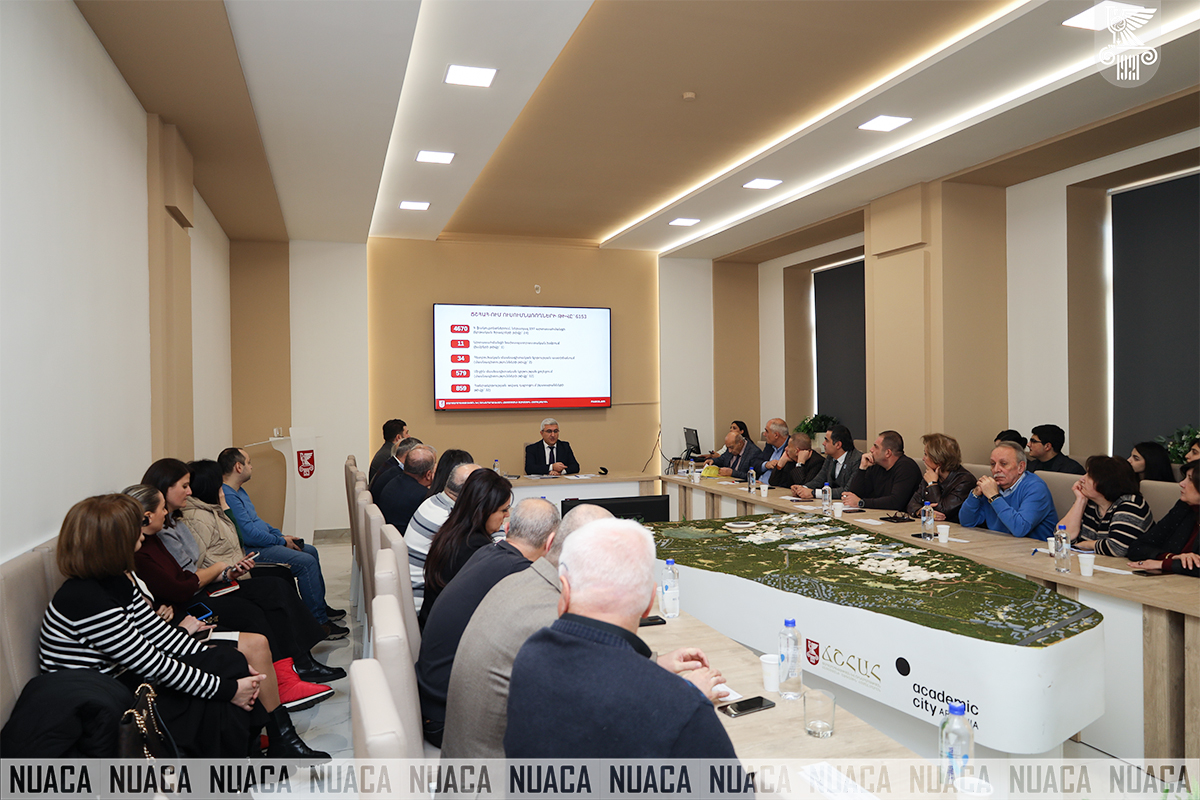 Նիստի օրակարգային հարցերը հաստատելուց հետո ռեկտոր Մանուկ Բարսեղյանը ներկայացրեց համալսարանի 2025 թվականի տարեկան հաշվետվությունը՝ ընդգծելով, որ այդ ժամանակահատվածում արձանագրված ձեռքբերումներն ու առաջընթացը հնարավոր են դարձել բուհի պրոֆեսորադասախոսական կազմի, ուսանողների և գործընկեր կառույցների համատեղ, հետևողական և արդյունավետ աշխատանքի շնորհիվ։ Ռեկտորը անդրադարձավ կրթական, գիտական և կազմակերպչական ոլորտներում իրականացված ծրագրերին՝ կարևորելով համալսարանի զարգացման ռազմավարական ուղղությունները։
